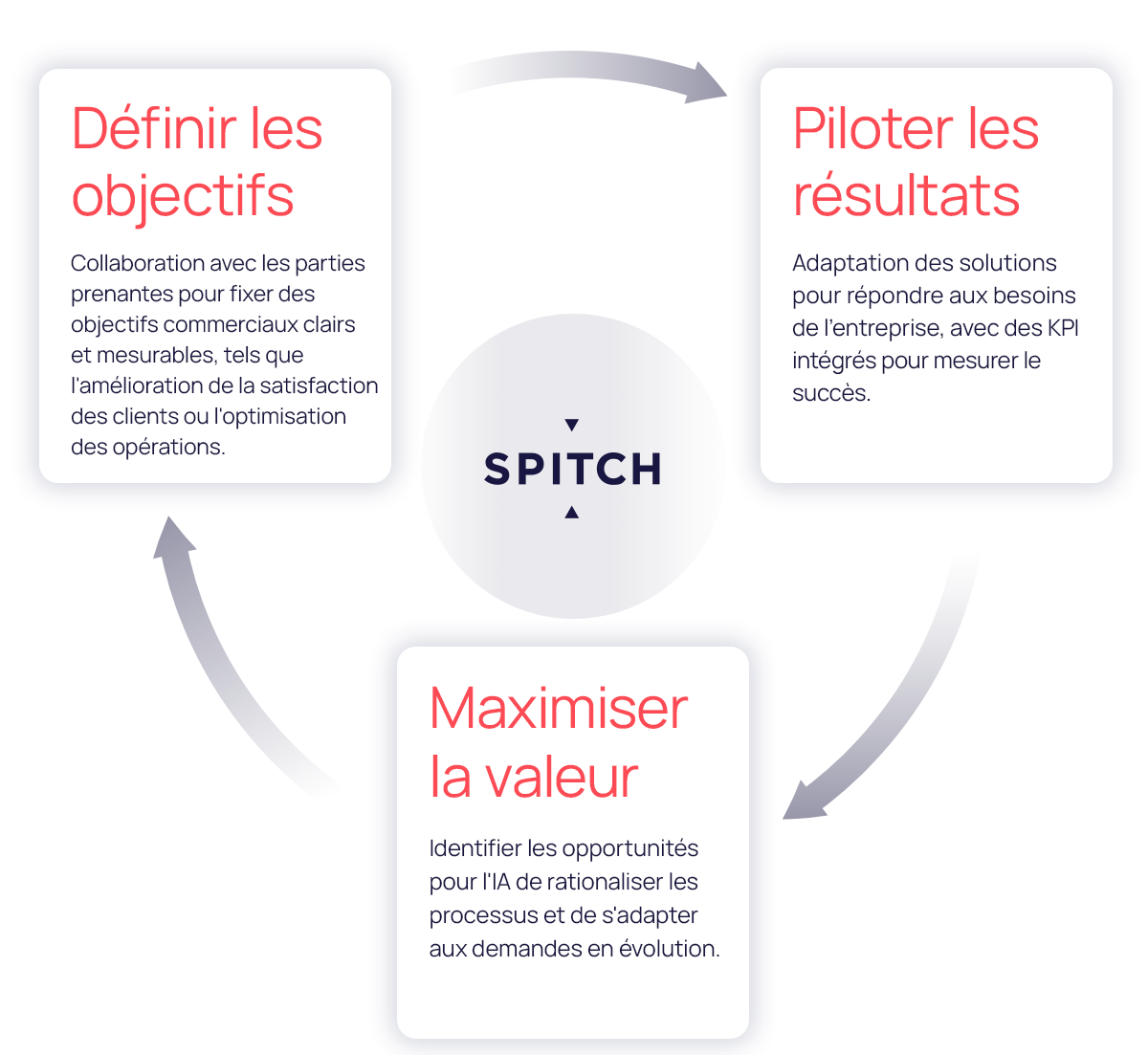 Depuis lors, le conseil stratégique et les services professionnels de Spitch ont été affinés pour fournir des déploiementse bien structurées et harmonieusement séquencées. Notre approche repose sur les trois piliers suivants: